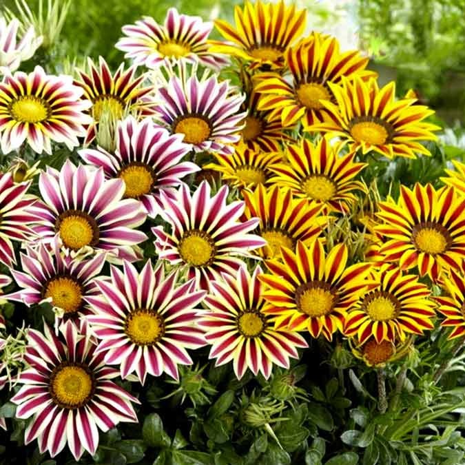 Благодаря контейнерной высадке данных растений, ими можно формировать любые цветочные живые композиции и украшать как уличное пространство, так и помещения. В эту смесь специалисты включили Гацанию желтого и белого окраса с эффектными красными вертикальными полосками на каждом лепестке. Цветение длится с начала лета по конец первого осеннего месяца.