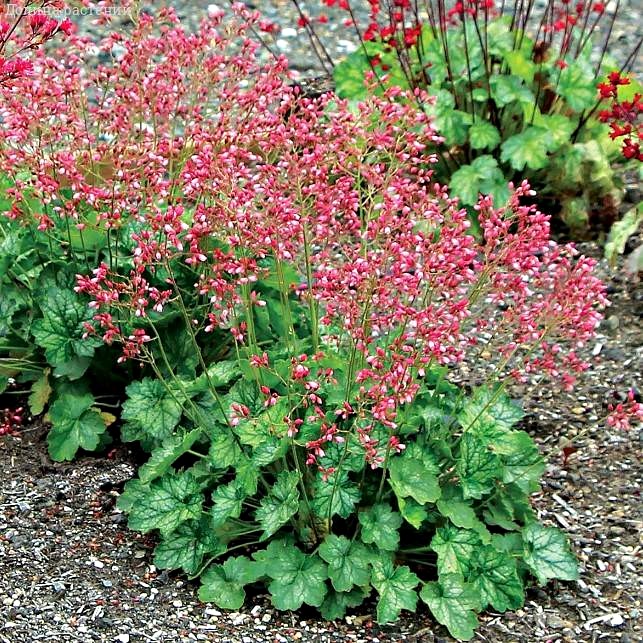 Декоративно-лиственный многолетник. Хорошо переносит зимние холода. Гейхера, выращенная из семян, обладает комплексной устойчивостью к неблагоприятным факторам среды. Она формирует аккуратные плотные розетки листьев высотой около 10 см. Летом из них появляются тонкие цветоносные побеги длиной до 40 см. Миниатюрные милые цветки на фоне изумрудной зелени выглядят изысканно и колоритно. В саду сорт украсит каменистые горки и миксбордеры. Его часто высаживают в виде окантовочной культуры, потому что листья гейхеры остаются зелеными вплоть до снежного покрова.