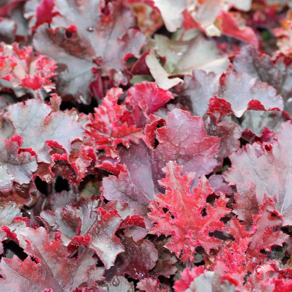 «Тающий огонь» – так переводится название этой гейхеры. Если посмотреть на серебристо-бордовые листья, то действительно возникают ассоциации с пламенем, которое угасает, тает под зимним снегом, покрывшим сверху жаркие угольки. Это самый яркий гибрид среди всех остальных, он очень красив: своим присутствием облагораживает любое пространство необычной окраской листьев.Молодые листья имеют окрас интенсивного пурпурно-красного цвета, старые - более темные, насыщенные. Они эффектно сочетаются с более светлыми сортами. Растение образует невысокую компактную розетку с волнистыми листьями.