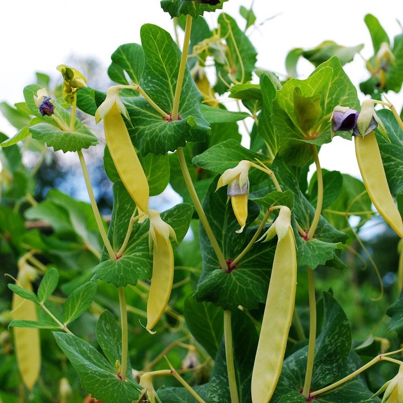 Желтые сладкие стручки. Эффектное украшение сада. Необычный редкий сорт вьющегося сахарного гороха родом из Индии. Срок созревания 65-67 дней. Молодые стручки не имеют пергаментного слоя и употребляются в пищу целиком. Благодаря красноватым стеблям, пурпурным цветкам и золотистым бобам сорт отлично подходит для украшения декоративной клумбы. Растение высотой 140-180 см, быстрорастущее, жаростойкое. Характеризуется обильным и длительным плодоношением. Урожай можно собирать в течение 1 месяца. Стручки лимонно-желтые, плоские, длинные, очень нежные и сладкие. Яркий цвет бобов отличное украшение летних овощных блюд. Нежные лопатки иcпoльзyются для приготовления овощных ассорти, салатов, гарниров, консервирования и заморозки.