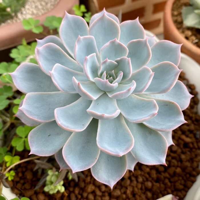 Быстрорастущие растения с розетками серебряно-синих листьев с красноватыми кончиками, похожими на объёмные звёзды. Размер розетки до 15 см. Для ёмкостей и открытого грунта. Хорошее дополнение к композициям с яркими цветами.