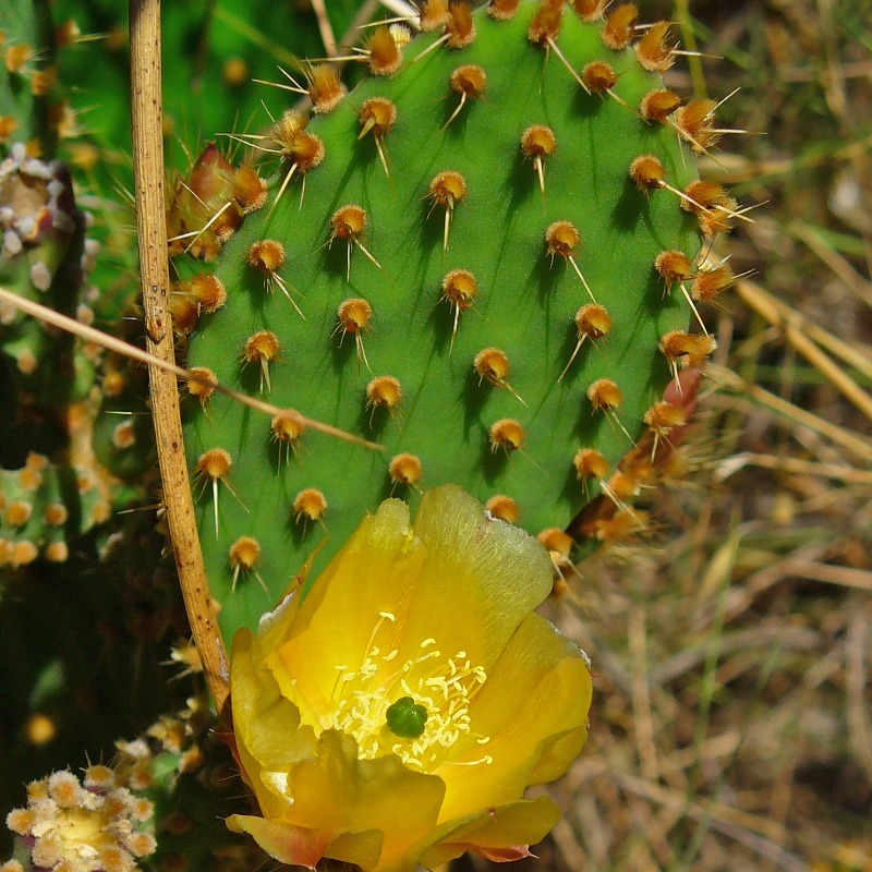 Декоративный со съедобными плодами. Кактус, который может достигать высоты 3,5-4 м. Его сегменты вырастают до 30 см и имеют зелёный или сине-зелёный оттенок. Они покрыты колючками и глохидиями (волосками, шипами). Цветки растения могут быть жёлтыми или красноватыми, их диаметр составляет 5-8 см. Плоды имеют пурпурный цвет. Этот вид кактуса растёт в дикой природе в США и Мексике. Он также культивируется в декоративных целях, хотя его плоды можно употреблять в пищу. В Крыму этот кактус может переносить небольшие минусовые температуры. Молодые растения могут подмерзать при -10⁰C, но по мере взросления их морозостойкость увеличивается.