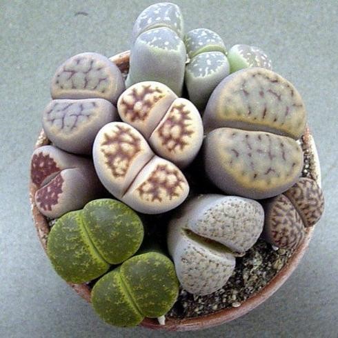 Удивительные маленькие бесстебельные многолетние суккуленты, которые происходят из Южной Африки. В природе они обитают в условиях сухого пустынного климата, что делает их идеально приспособленными к низкому уровню влажности. Несмотря на суровые условия, литопсы образуют обширные колонии, иногда полностью скрываясь под слоем песка или камней. Обладая удивительной способностью мимикрировать под окружающую среду, они окрашивают свои листья в цвет каменистого грунта, чтобы избежать поедания животными. Растение не имеет стебля, а состоит из двух сросшихся плотных листьев с небольшой щелью между ними. Из этой щели прорастают цветок и корень. Толстые листья способны накапливать влагу, что помогает литопсам пережить засушливые периоды. Листочки разделены щелью-ложбинкой, в которой можно увидеть светло-зелёные клетки меристемы. Именно из этой щели появляются цветы и новые листья. В высоту все растения не превышают 5 см, а максимальный диаметр составляет 4-6 см.