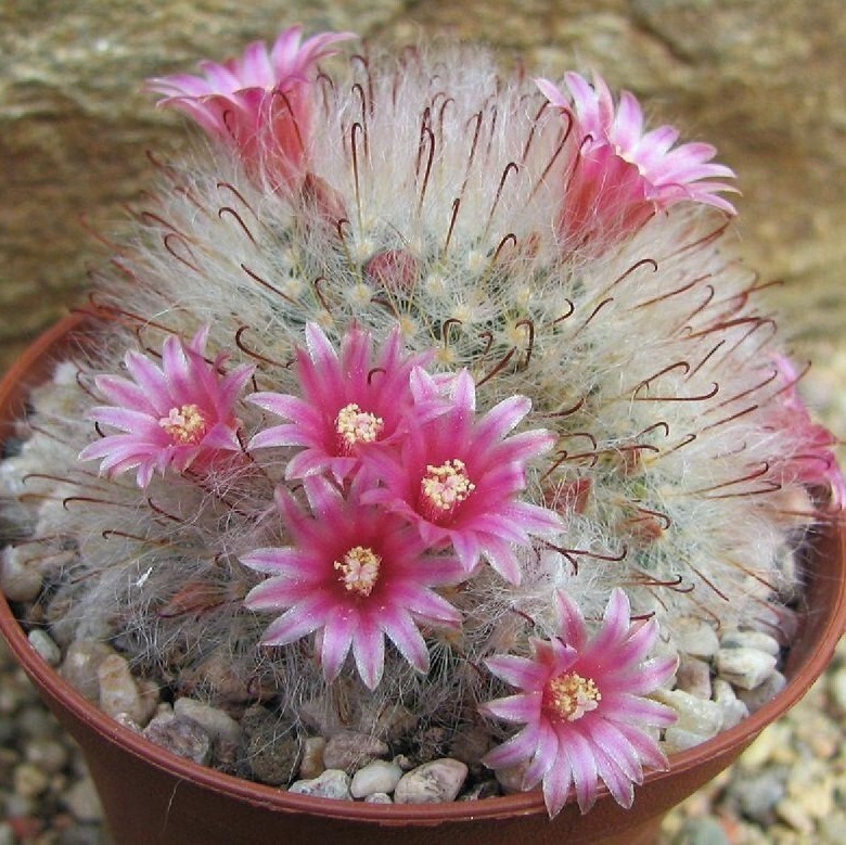 Многие ценители домашних растений предпочитают маммиллярии: небольшие колючие «комочки-клубочки» очаровывают своим аккуратным, миниатюрным видом и удивительно нежными бутонами во время цветения. Они неприхотливы, быстро размножаются и регулярно цветут, что делает их популярными среди начинающих цветоводов. Кактус имеет круглую и удлиненную форму стебля с серебристым опушением, диаметром 5-6 см, высотой 8-10 см, темно-зеленого окраса. Колючки тонкие, бурые, с загнутым кончиком, длиной 8-10 мм. Поздней весной растение покрывается множеством нежно-розовых мелких воронковидных бутонов. Стебель растения у основания сильно разветвленный.