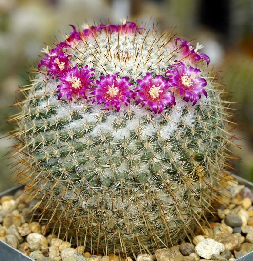 У многих кактусы ассоциируются лишь с колючками и суровым характером этих растений, которые способны произрастать в наиболее засушливых уголках планеты. Но, увидев единожды хотя бы несколько видов цветущих растений, можно навсегда изменить представление об этих чудесных «колючках». Маммиллярия является одним из самых распространенных кактусов, которые выращиваются в домашних условиях без особых усилий. Популярность данного комнатного цветка оправдана не только особенностями выращивания, но и тем, что он может стать удачным дополнением интерьера. Маммиллярия белошерстная — медленно растущий, кустящийся кактус, так густо покрытый колючками и шерстью в аксилах, что эпидермис почти полностью скрыт. Стебель бочковидный, вытянутый с плоской, вдавленной макушкой 10-15 см высотой и 4-8 см в диаметре. Сосочки серо-зеленого цвета, твердые, расположены на стебле по спирали, без млечного сока. Цветет, начиная с поздней весны, очень маленькими (7-8 мм), звездчатыми цветками карминового, пурпурно-розового или розового цвета, расположенными на верхушке кактуса в виде венчика. Любит яркое освещение и прямые солнечные лучи. Зимний покой (оптимальная температура 8-10оС.), во время которого высота растения может уменьшаться, стимулирует цветение и продолжительность жизни кактуса.