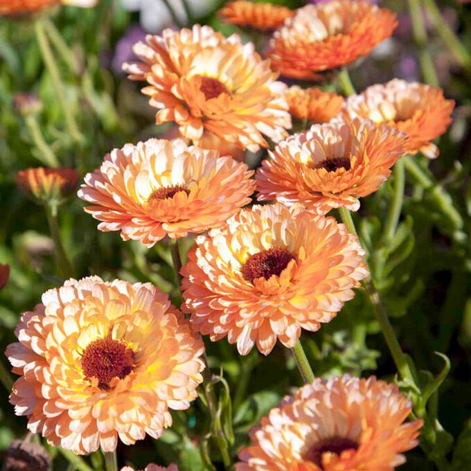 Популярное однолетнее неприхотливое садовое растение. Цветки крупные, махровые, очень эффектные: кремово-абрикосового цвета, обратная сторона лепестков – темно-красная. Цветение длится с июня до заморозков. Неприхотливость к условиям произрастания делает календулу незаменимым растением для декорации сада, а так же балконных ящиков, вазонов.