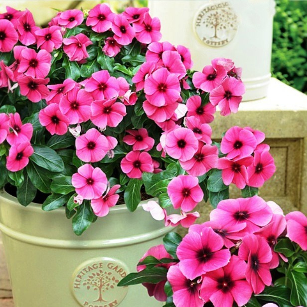 Цветки крупные, диаметром 5-6 см, многочисленные, долго живущие. Очень необычная окраска. Плотный куст с короткими междоузлиями и красивыми темно-зелеными блестящими ланцетовидными листьями, на фоне которых особенно эффектно сияют необычные цветки. Великолепно подходит для выращивания в сухих солнечных условиях.