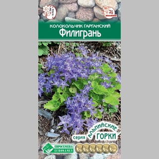 »Филигрань» - единственный колокольчик данного типа, цветущий в год посева, холодная фаза для цветения ему не нужна. Он филигранно раскрывает массу маленьких светло-голубых цветочков, похожих на звездочки, а кустики компактные могут иметь округлый или стелющийся габитус. В пору цветения кустики покрываются так обильно цветочками, что едва можно увидеть зелень листвы. Этот синий красавчик прекрасно смотрится в сочетании с гвоздикой альпийской, щиловидными флоксами, различными овсяницами, незабудками, пионами и ирисами, но особенно неповторим он на фоне грубых камней. В этом контрасте проявляется их особая, нежная красота и хрупкость.
