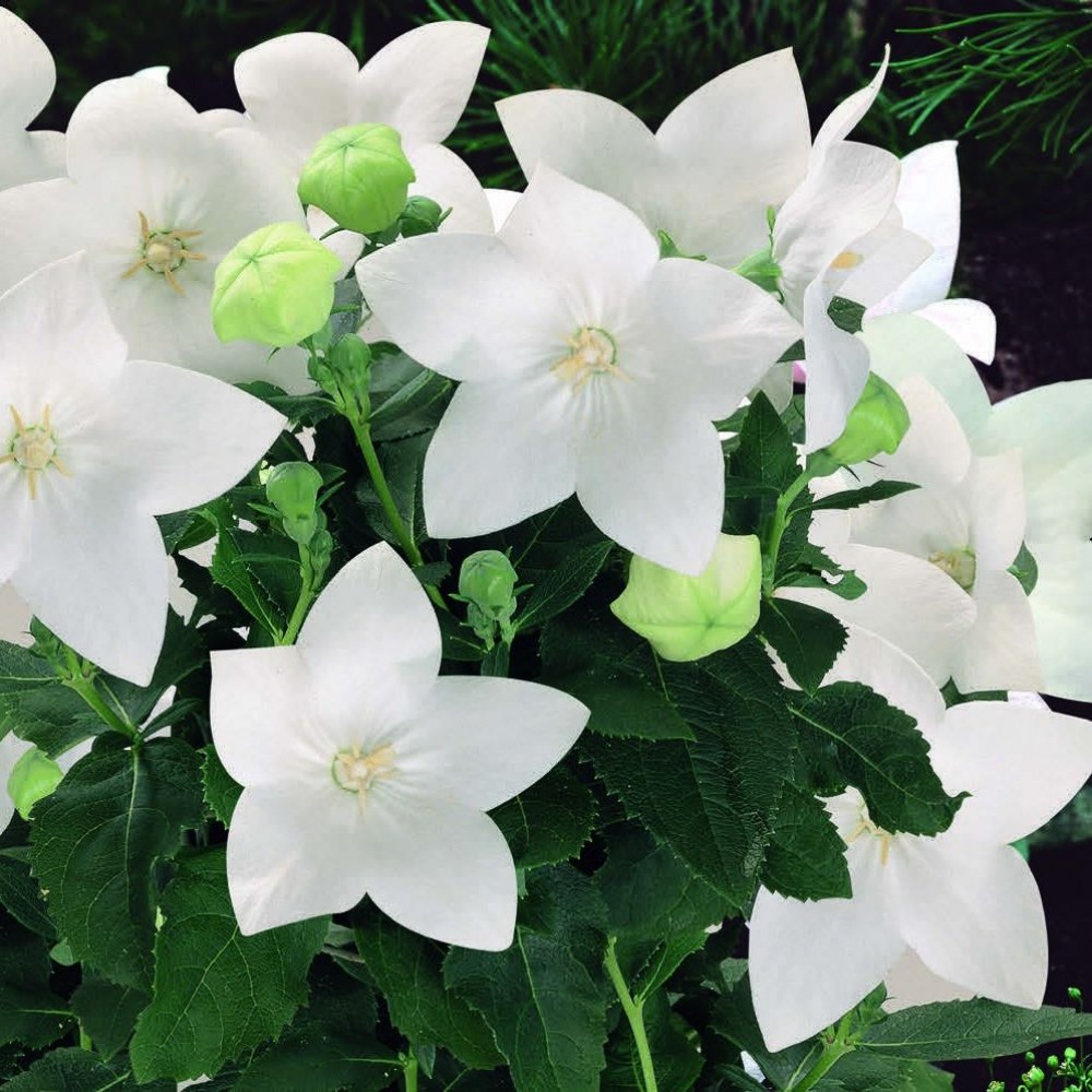 Красивое среднерослое растение с чашевидными, ширококолокольчатыми, крупными, до 6-8см в диаметре, белыми цветками, одиночными или собранными по 3-5 в рыхлые соцветия. Платикодон не требователен к почве, предпочитает открытые солнечные места, но выносит и полутень. Используется в групповых и одиночных посадках, идеально подходит для каменистых горок. Очень красиво смотрится в букетах.