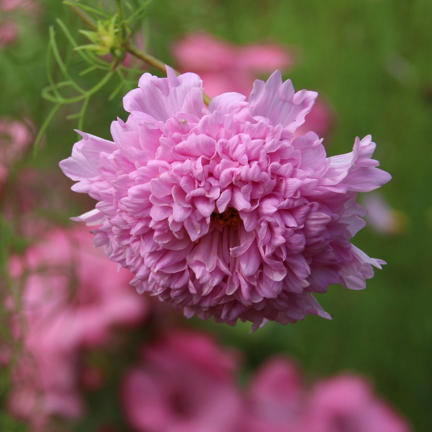 Цветущие побеги высокорослых сортов космеи прекрасно смотрятся в вазах. Те, кому нравится пышное, интенсивное цветение, оценили космею очень давно. Её хорошо сажать на заднем плане бордюра. Фон, образуемый мелкорассеченными перистыми листьями и многочисленными соцветиями, выглядит очень неформально.