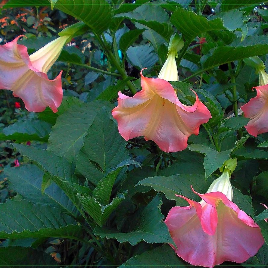 Мощное, очень красивое пышно цветущее растение из семейства Пасленовые. В умеренных широтах вырастает до 2 м. Тот, кто однажды увидит эту красавицу во время цветения, просто не сможет не влюбиться в неё. Гигантские трубчато-колокольчатые цветки достигают в длину до 30 см и в диаметре до 15 см, обладают сильным приятным ароматом, особенно в ночное время. Листья яйцевидные, достаточно крупные, длиной 20-30 см, ярко-зеленого цвета. Бругмансия хорошо переносит заморозки до -5С°, прекрасно подойдет для выращивания в кадках, которые зимой можно разместить в большом светлом помещении или зимнем саду.