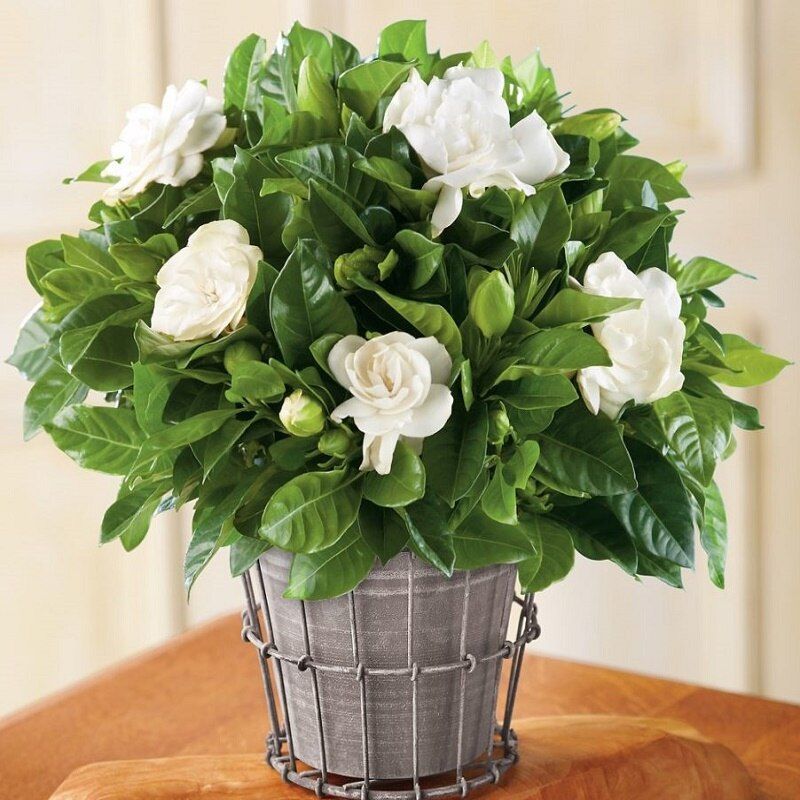 Вечнозеленый кустарник в природе (субтропики) до 2,4 м высотой и 1,5 м шириной семейства Мареновые (Rubiaceae). Листья противоположные или мутовчатые, темно-зеленые, гладкие, кожистые, блестящие, эллиптические, заостренные 5-10 см длиной. Цветки одиночные или собраны в щитковидные соцветия, белые, позже желтеющие, с приятным, мощным, тонким ароматом, имеют форму розы, до 8 см в диаметре.