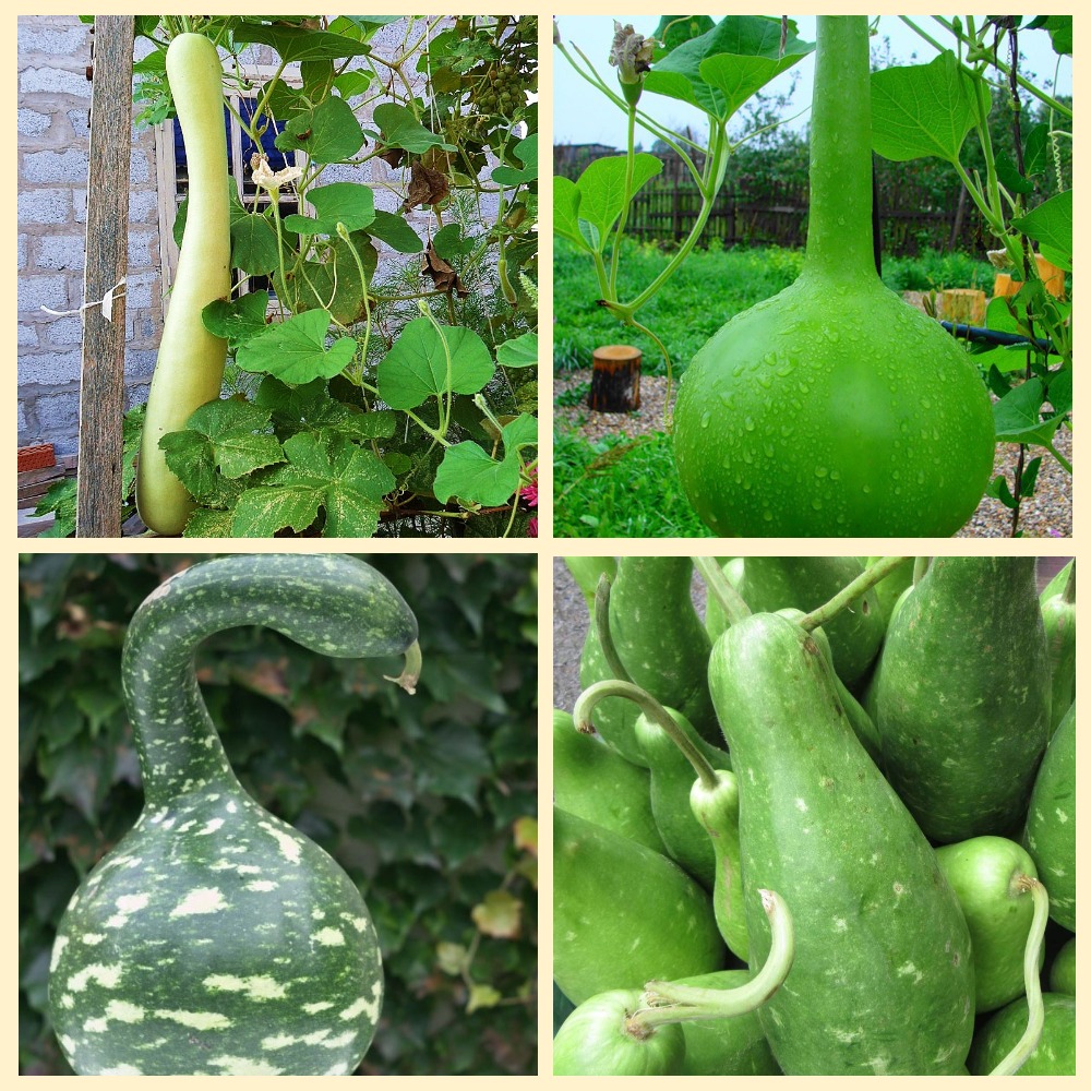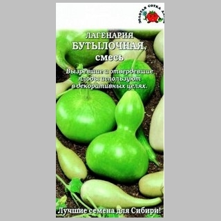 Декоративная разновидность лагенарии (вьетнамский кабачок, индийский огурец). Однолетняя лиана семейства тыквенных. Растение сильнорослое, сильноветвистое, с цепкими усами, весьма декоративно и отлично подходит для вертикального озеленения. Листья нежно-зеленого цвета, округлые, крупные, бархатистые. Цветы белые, крупные, похожи на раскрытые колокольчики. Плоды очень оригинальные, напоминают различные по форме кувшины, сосуды и бутыли. Сами тыквы светло-зеленые или темно-зеленые, могут быть с вкраплениями белого цвета. Плоды бутылочной лагенарии имеют невкусную мякоть и в пищу практически не употребляются. Вызревшие и отвердевшие тыквины используют в декоративных целях для изготовления разнообразных сувениров и предметов обихола: шкатулки, ложки, вазы, погремушки, чаши, бутыли и даже светильники.