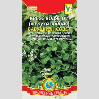 Кресс водяной или Жеруха водная (она же лекарственная, обыкновенная) это быстрорастущее многолетнее влаголюбивое растение семейства Капустные, растущее обычно около ручьев, ключей или других, проточных водоемов. Обычно возделывают как однолетнюю культуру. Стебли стелющиеся, полые, достигают 50-70 см в длину. Листья темно-зеленые, блестящие, перисто-рассеченные, на широких черешках с 3-7-ю парами продолговатых или овальных долей. Цветки белые мелкие, собраны в короткие кисти. Молодые листья имеют терпкий, горчичный вкус и резкий приятный аромат, в кулинарии их применяют в свежем виде в качестве приправы к салатам, мясным, овощным и яичным блюдам. Пищевые и диетические достоинства растения связаны с высоким содержанием витаминов, йода и минеральных веществ, особенно солей кальция, калия, фосфора и железа. По содержанию бетакаротина превосходит сельдерей и лук. В комплексе с другими растениями соки или настои на основе Жерухи являются эффективным кровоочистительным и глистогонным средством, полезным при заболеваниях щитовидной железы, почек, печени, диабете, хронических бронхитах, ожирении, хорошее противоцинготное средство.