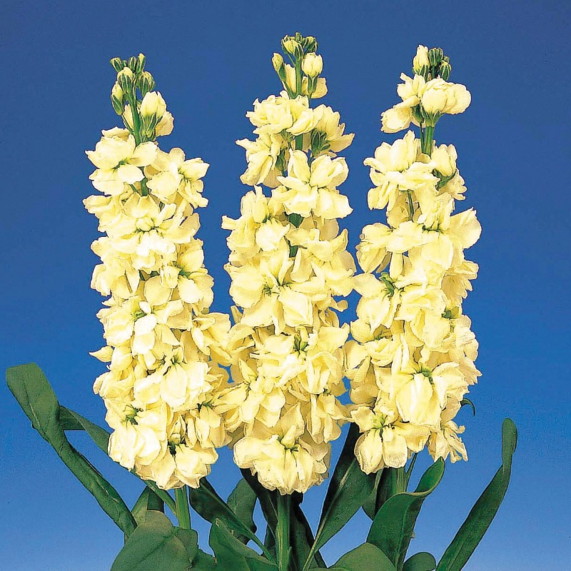 Неповторимый, сладкий аромат, длительное цветение и прочные жесткие стебли делают левкои серии «Iron» Sakata популярными у цветоводов. Растения прямостоячие, высотой 60-70 см. Крупные (диаметром 4-4,5 см) махровые цветки желтого оттенка собраны в плотные кистевидные соцветия. Прекрасно подходят для профессиональной срезки для оформления цветников. Зацветает левкой в июне.