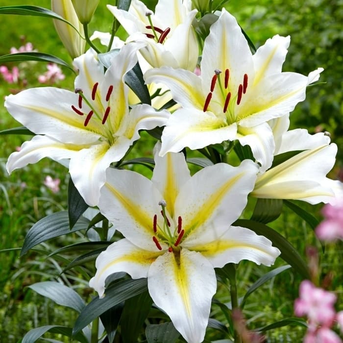 Восточные гибриды – аристократы в мире лилий! Цветки душистые, очень крупные, просто огромные, экзотических окрасок: бело-розовые, белые, малиновые, розовые с крапинками и полосками по центру волнистых лепестков или без них. На зиму требуют укрытия. Цветут в июле-сентябре.