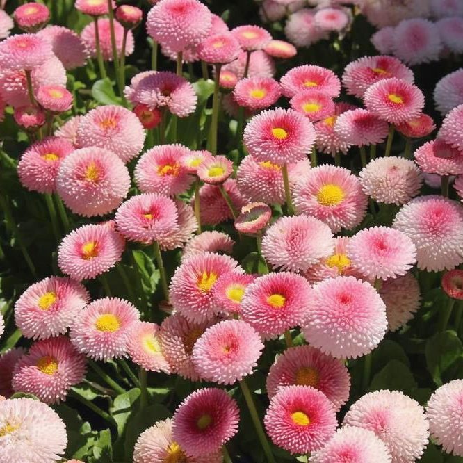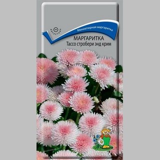 Изумительной красоты маргаритки высотой до 12 см. Компактное растение с коротким сильным стеблем. Многочисленные крупные розово-кремовые соцветия с плотными трубчатыми лепестками, диаметром до 4 см. Универсальное использование: как почвопокровное растение, для обрамления клумб, балконных ящиков, альпинариев.