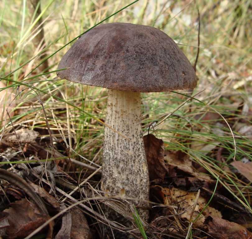 Ножка. Длиной 5-12 (20) см и диаметром 1-3 см, длинная, цилиндрическая, слабо расширенная к основанию, плотная, продольно-волокнистая, беловатая с темно-серыми или черно-бурыми продольными чешуйками.
