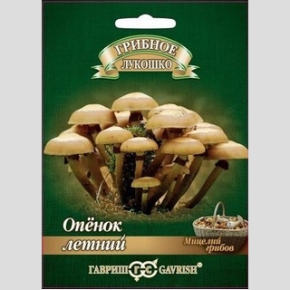 Традиционный в России съедобный гриб, всегда ценился за обильный урожай, сильный аромат и нежную мякоть. Опенок летний, в природных условиях, появляется в июне и сходит к концу августа, оправдывая свое название. Шляпка диаметром 4-6 см, в молодом возрасте полукруглая, позднее плоско-выпуклая с выступающим в центре бугром. Окраска ржаво-буро-коричневая, с концентрическими, более светлыми полосами. Мякоть белая, водянистая, довольно тонкая. Ножка цилиндрическая, немного суженная книзу, иногда с кольцом. Перед употреблением опята рекомендуется отварить и отвар слить. Далее грибы можно жарить, солить, мариновать, добавлять в супы. Сушеные грибы отваривать не обязательно. Советы по разведению: Выращивают как на открытом воздухе, так и в закрытых помещениях при температуре от 10 до 27°С. Благоприятное время для высадки грибов на древесную основу в природных условиях — с апреля по май или в августе, в помещении — в течение всего года. В качестве древесной основы используют свежее (1 месяц после срубки), влажное (влажность минимум 50-60 %) бревно лиственных пород (бук, граб, ольха, осина, ясень, клен, береза, тополь, ива, каштан, дуб) без признаков гнили, с корой и без веток, диаметром 20-50 см, длиной 30-50 см. Если древесина сухая ее замачивают в воде на 2-3 дня, избытку воды дают стечь. Пропитанную древесину помещают в теплое, проветриваемое помещение на несколько дней. Выращивание и уход: I этап - 1. В подготовленном бревне просверливают отверстия диаметром 0,8 см и длиной 4 см в шахматном порядке на расстоянии около 10 см друг от друга. 2. Вставляют грибные палочки в отверстия до упора (операцию проделывают в стерильных перчатках или продезинфецированными спиртом руками). 3. Оборачивают бревно полиэтиленовой пленкой, сделав небольшие отверстия для доступа воздуха. 4. Помещают бревно в темное влажное помещение и оставляют обрастать мицелием. При температуре 20 ?С бревно обрастает 2-3 месяца, при температуре 10 ?С – 3-4 месяца. При температуре выше 33 ?С мицелий может погибнуть. Бревна заросли если на поверхности, в местах заражения, виден белый мицелий. II этап - 1. В затененном и защищенном от ветра месте в саду выкапывают лунку глубиной 10-15 см, дно лунки увлажняют. Можно выращивать на балконе, посадив древесину после оброста мицелием в кадку с землей. 2. Обросшее грибницей бревно закапывают горизонтально в землю на ? толщины. Обсыпают почву вокруг бревна древесной золой (для борьбы с улитками). Оптимальная температура для образования плодовых тел – от 14 до 18°С. 3. В сухую погоду почву вокруг бревна поливают каждую неделю из расчета 5л на 1м?. Поздней осенью бревно присыпают листьями и оставляют зимовать. 4. Со следующей весны закладку регулярно увлажняют по мере необходимости. Плодоношение: Первый урожай при выращивании на мягкой древесине (береза, тополь, ива, липа) через 4 месяцев, на твердой (бук, дуб, ясень, клен) – через 9 месяцев. Плодоношение волнами до 5 лет на мягкой древесине, до 8 лет на твердой. Урожайность: От 20 до 50% от веса бревна. Состав: Мицелий грибов "Опенок летний" на древесных палочках. Невскрытый пакет хранить в сухом прохладном месте, возможно в холодильнике при положительной температуре.
