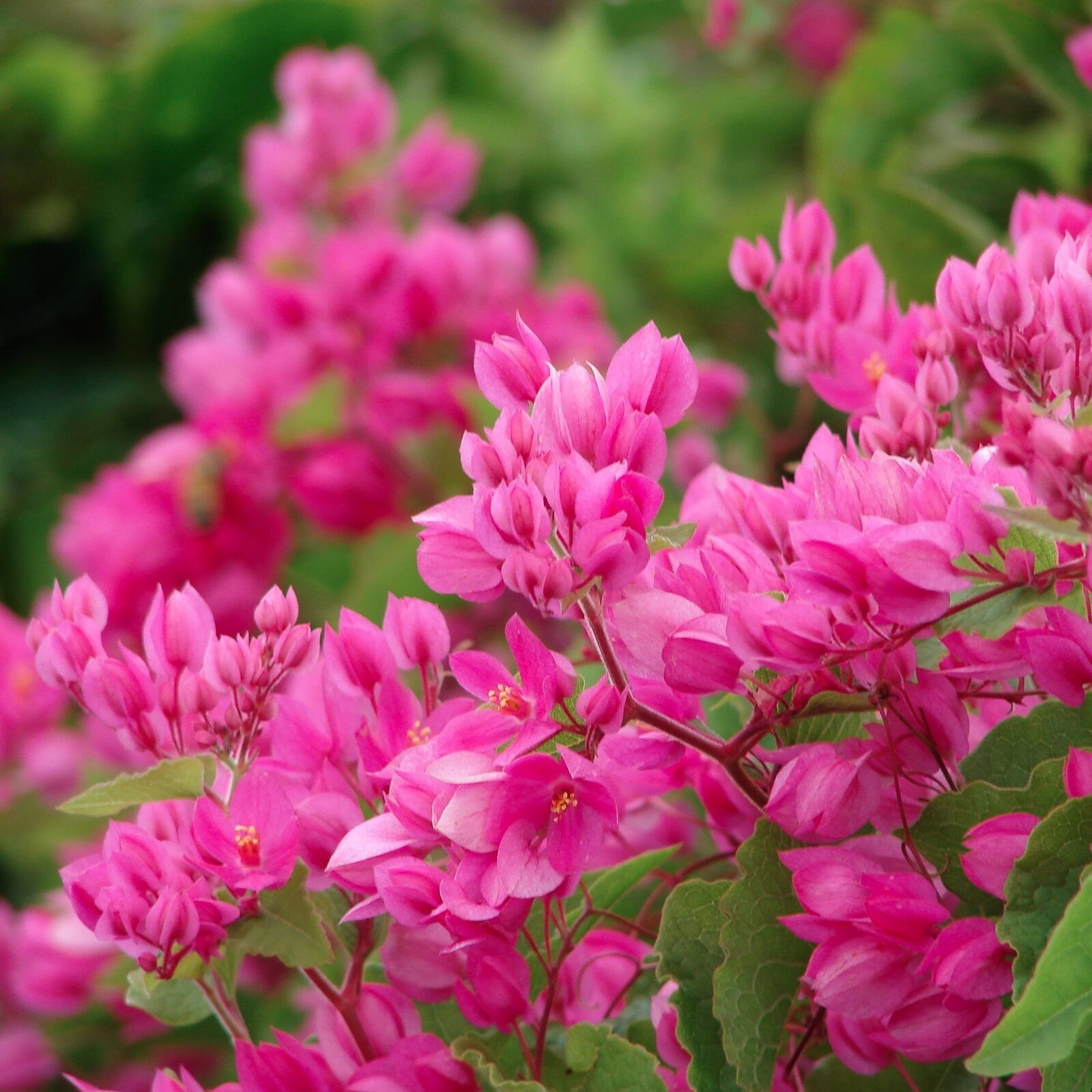 Вьющееся вечнозеленое растение со слегка одревесневающим стеблем из семейства Гречишные. В естественных условиях может достигать 13 м, но в культуре обычно вырастает до 6 м. Листья крупные, насыщенно-зеленые, сердцевидные, с бархатистой поверхностью. Ярко-розовые цветки собраны в пушистые кисти по 20 шт. После цветения на растении образуются плоды — конусовидные глянцевые орешки коричневого цвета. Характерной особенностью антигонона является наличие усиков не только в пазухах листьев, но и на концах цветочных кистей. И, когда эти усики прикрепляются к опорам, кажется, что растение украшено яркими бусами, и это придает ему совершенно неповторимое очарование.