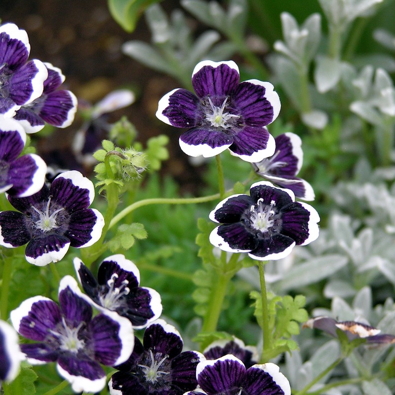 Необыкновенно красивый однолетник с компактным ветвистым кустиком высотой* 10-15 см. Цветки одиночные, диаметром 1,5-2 см, темно-фиолетового или почти черного цвета с белой окантовкой по краям лепестков. При выращивании в контейнерах и подвесных корзинах растения образуют плотный каскад зелени и цветков, который великолепно смотрится на переднем плане цветочных композиций. Немофила легко комбинируется с другими растениями и прекрасно подходит для бордюров вдоль дорожек. Обильное и продолжительное цветение возможно только на солнечных участках.