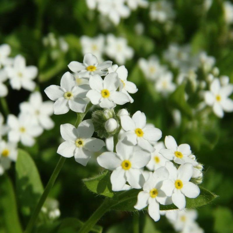 Myosotis alpestrisРаннее красивоцветущее почвопокровное растение с ветвистым стеблем. Высотой 25-30см. Крупные цветки снежно-белой окрасок собраны в рыхлые короткие соцветия-завиток. Растения зимостойкие, хорошо переносят пересадку в течение весны-лета в цветущем состоянии. Великолепно смотрятся не только на клумбе, но и в горшке или балконном ящике. На балконе или террасе незабудки хороши в комбинации с другими двулетними растениями. Долго стоит в срезке.