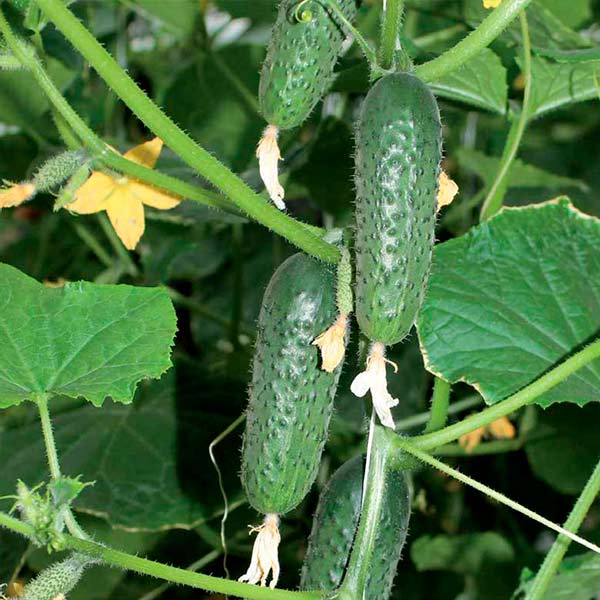 Пчелоопыляемый черношипый гибрид. Раннего срока созревания – формирует урожай через 40-45 дней после всходов. Рекомендуется для выращивания в открытом грунте и под пленочными укрытиями. Женского типа цветения. Склонен к образованию пучковых завязей. В каждом узле формируется 4-6*. Молодые огурчики 10-12 см длиной, с крупными бугорками. Вкус и аромат отличные – плоды хрустящие, сочные, совершенно без горечи. Гибрид прекрасно подойдет для засолки, ма ринования и консервации. Урожайность под пленкой – 14-16 кг/м2 , в о/г – 8-10 кг/м2.