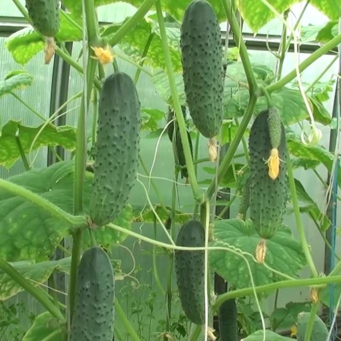 Новый, очень продуктивный партенокарпический гибрид с букетным типом цветения. Подходит для теплиц и открытого грунта. Гибрид раннеспелый, от всходов до сбора первых плодов 42-45 дней. Закладывает по 5-8 завязей в узле, а при интенсивном уходе до 10. Плоды средней массой 80-90 г имеют типичную «голландскую рубашку» – частые бугорки среднего размера и мелкие белые шипы. Зеленцы корнишонного типа, без малейшей горечи, сладковатые, сочные, с хрустом – идеальные овощи для жарких летних дней. Хороши в салатах, для соления и консервирования. Гибрид устойчив к МР и корневым гнилям. Толерантен к пероноспорозу. Урожайность под пленкой 14-18 кг/м 2.
