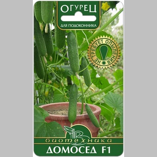 Домосед F1 - раннеспелый 100% партенокарпический гибрид с женским типом цветения. При посеве в осенне-зимний период, от всходов до начала плодоношения 56-61 день, в весенне-летний при весеннем посеве 43-45 дней. Плод цилиндрический, с гладкой, глянцевой поверхностью, длиной 14 см, диаметром 3,5-4 см. Генетически свободен от горечи. Предназначен для потребления в свежем виде. Вынослив к мучнистой росе и ложной мучнистой росе.