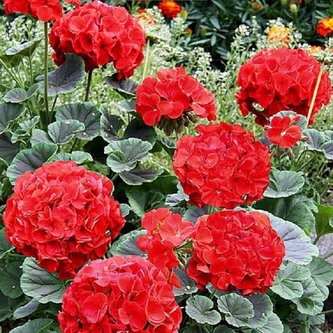 Крупная садовая пеларгония с большими шаровидными соцветиями диаметром до 15 см. Профессиональная пеларгония с большими листьями шоколадного цвета. На их фоне эффектно смотрятся очень крупные шаровидные соцветия различной окраски. Отличается большой розеткой декоративных листьев и крупными соцветиями на коротких цветоносах. Растение высотой 30-35 см, цветы собраны в плотные соцветия на коротких цветоносах, что дает не только эффектный внешний вид, но и обеспечивает устойчивость растения к ветру и дождям Отличные растения для вазонов.
