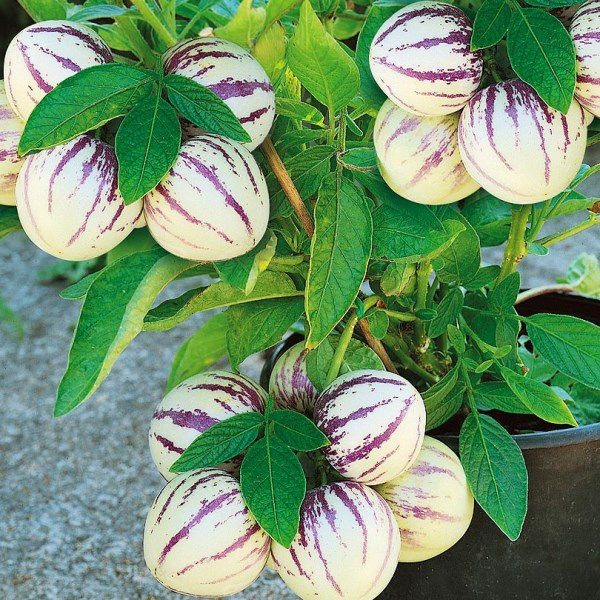 Другое название растения – дынная груша. Интересно своими плодами молочно-белого цвета с контрастными сиреневыми полосками. Мякоть плодов сочная, кисло-сладкая, с сильным ароматом дыни и фруктовым привкусом. Едят их свежими, добавляют в салаты, сушат или консервируют. В холоде плоды хранятся до 2,5 месяцев. Вечнозеленое многолетнее растение, может выращиваться в теплицах, а на зиму его переносят в теплое место. Уход такой же, как за томатами или баклажанам.