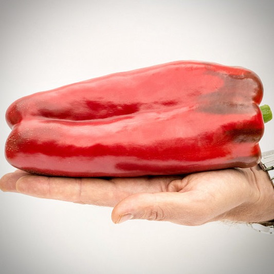Гибрид среднеспелый. От высадки рассады до созревания плодов 75-80 дней, растение мощное, хорошо облиственное, высотой до 140 см. Плоды крупные, призмовидной формы, в биологической спелости ярко красного цвета, длиной 18 см, средний диаметр 10 см, массой свыше 200 г, с толщиной стенки около 8 мм.