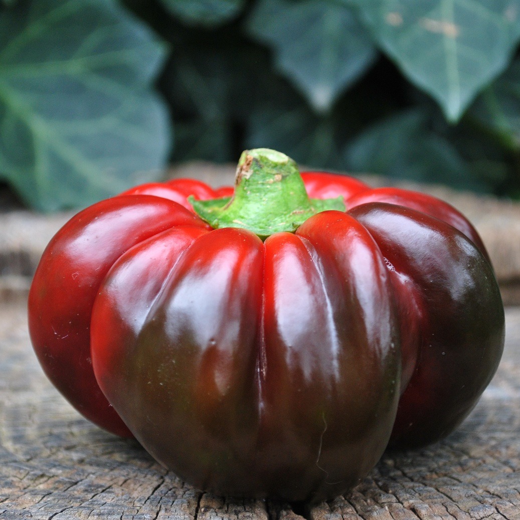 Среднеранний (110-115 дней) сорт для открытого грунта и пленочных теплиц. Растение полураскидистое, штамбовое, высотой 50-60 см. Плоды крупные, округло-плоские (томатовидные),  ребристые, в технической спелости тёмно-зеленые, в биологической – красные, массой 90-130 г, толщина стенки 8-9 мм, с сочной и сладкой мякотью и острой пикантной перегородкой. Урожайность 7-10 кг/м2.