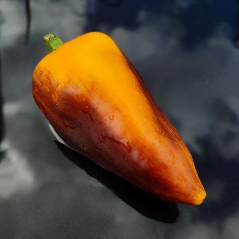 Среднеранний (95-105 дней) сорт для открытого грунта и теплиц. Куст компактный, высотой 30-45 ми, не требует формирования. Плоды конусовидные, глянцевые, оригинальной окраски: в технической спелости ярко-желтые с темно-фиолетовыми штрихами, в биологической приобретают насыщенную оранжевую окраску с темно-красными и фиолетовыми штрихами, массой 200-300 г, отдельные плоды до 400 г, толщина стенки 7-8 мм. Сорт отлично подходит для потребления в свежем виде, для зимних заготовок и заморозки, имеет яркий вкус и аромат.Предпочитает солнечные участки с легкими плодородными нейтральными почвами. Можно выращивать после моркови, капусты, свеклы, бобовых и тыквенных культур.