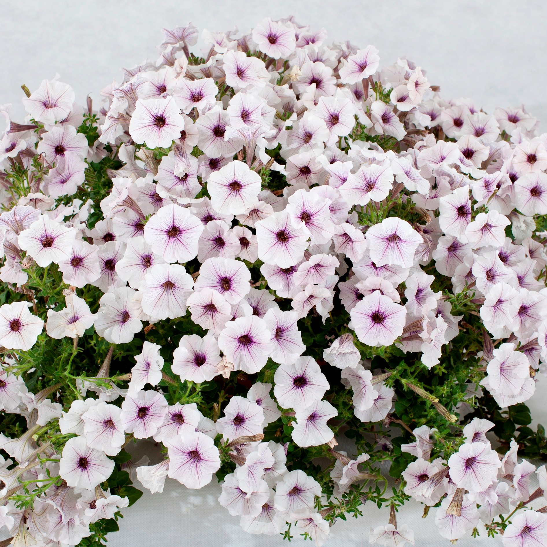 Растение напоминает калибрахоа: длинные ниспадающие побеги, достигающие в длину до 1 метра, направлены вверх и в стороны - благодаря этому середина куста никогда не бывает пустой. Относится к группе минимультифлора. Размер цветка - 2-3 см. Окраска - белая с пурпурными жилками. Непрерывно цветёт с ранней весны до поздней осени, благодаря гену мужской стерильности. Высокая устойчивость как к повышенным, так и пониженным температурам. Быстро восстанавливается после дождей. Подходит для кашпо, подвесных корзин и ландшафтного дизайна.