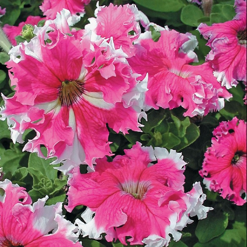 Потрясающе красивый гибрид с компактной формой куста. Крупные ажурные цветы, образованные волнистыми лепестками с бахромчатым краем, поражают необычностью расцветки: темно-розово-фиолетовые пятна и полосы на белом фоне. Цветет обильно и продолжительно.
