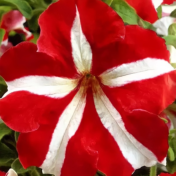 Цветет с июня по сентябрь. Цветки красные с белыми лучами 7-10 см в диаметре. Светолюбива и достаточно засухоустойчива. Предпочитает легкие, плодородные, хорошо дренированные почвы. Петунии можно выращивать в течение нескольких лет, сохраняя зимой в освещенном помещении (растение сильно обрезают, t не более 12°C, умеренный полив). Петуния используется как фоновое и балконное растение, в контейнерах, вазах, для украшения подоконников, для посадки в рабатки, бордюры. Цветет обильно с начала мая до заморозков. Устойчива к неблагоприятным условиям.