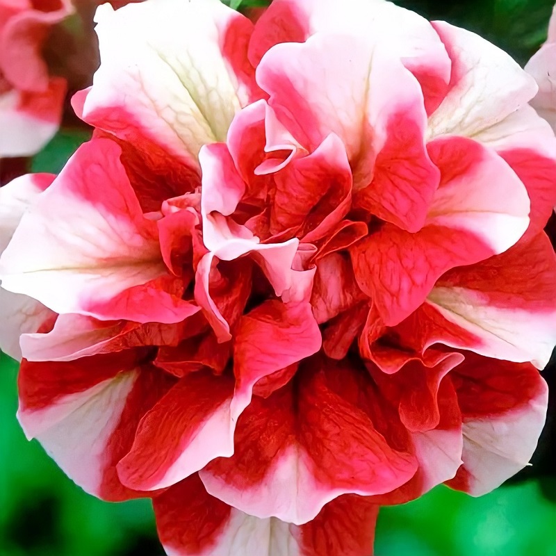 Многоцветковая махровая серия, очень рано всупает в цветение. Роскошное однолетнее растение с высокой устойчивостью к неблагоприятным погодным условиям. Эта гибридная форма петунии имеет объемный компактный и ветвистый кустик высотой 25-35 см и диаметром 25-30 см. Цветки красные с белым рисунком, многочисленные, до 5-5,5 см в диаметре.