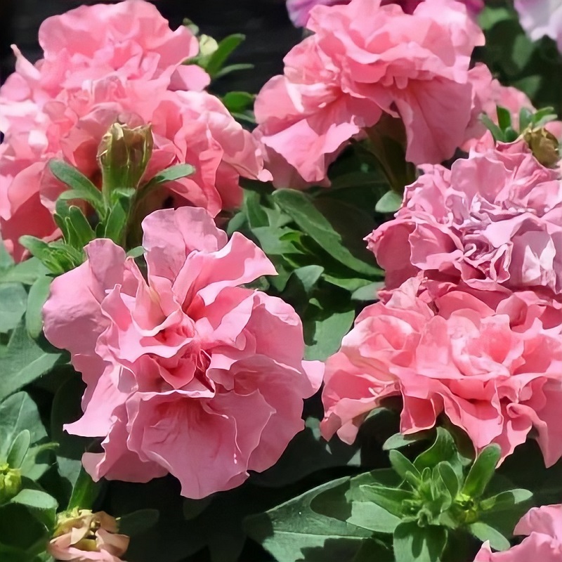 Многоцветковая махровая серия, очень рано вступает в цветение. Роскошное однолетнее растение с высокой устойчивостью к неблагоприятным погодным условиям. Эта гибридная форма петунии имеет объемный компактный и ветвистый кустик высотой 25-35 см и диаметром 25-30 см. Цветки бледно-лососевые, многочисленные, до 10-13 см в диаметре, похожи на цветки гвоздики, с прочной фактурой, не страдают во время дождей.
