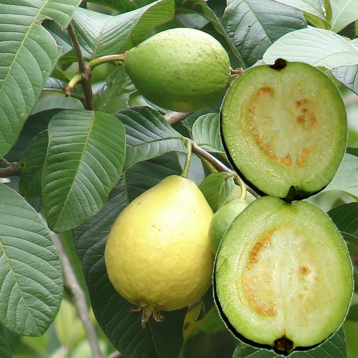 Тропическое растение семейства Миртовые, родом из Центральной и Южной Америки. В комнатных условиях гуайаву выращивают в виде кустарника или деревца. Побеги четырехгранные, с розовым оттенком. Листья эллиптические, супротивные, темно-зеленые, длиной 8-15, шириной 3-5 см, глянцевые или матовые сверху, снизу-опушенные. Цветы ароматные, белые или бело-розовые, одиночные или по 2-3 в пазухах листьев. Плоды размером 5-10 см, округло-грушевидные, с вкусной и ароматной желто-розовой мякотью. Зрелый плод весом 100 г может содержать до 900 мг витамина С. Для гуайавы характерен сладкий аромат, напоминающий и грушу, и айву, и инжир. Часто плоды используют в недозрелом виде, когда мякоть фрукта еще зеленая и более твердая, с солью, сахаром и специями. Плодоносить начинает на 3-4-й год.