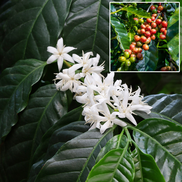 кожистые, большие (до 15 см длиной), продолговатой формы, заостренные на конце и волнистые по краю, супротивно-расположенные. Цветки пазушные, душистые, собраны по 5-6 штук, на коротких цветоножках. Венчик цветка пятилепестной, белый. Цветение в апреле - мае. Плоды – ягоды с 2-3 семенами, напоминающие мелкую черешню (их сладковатая мякоть съедобна), появляются только на взрослых растениях (3-4 года), из которых можно собрать урожай до 0,5 кг кофейных зерен.