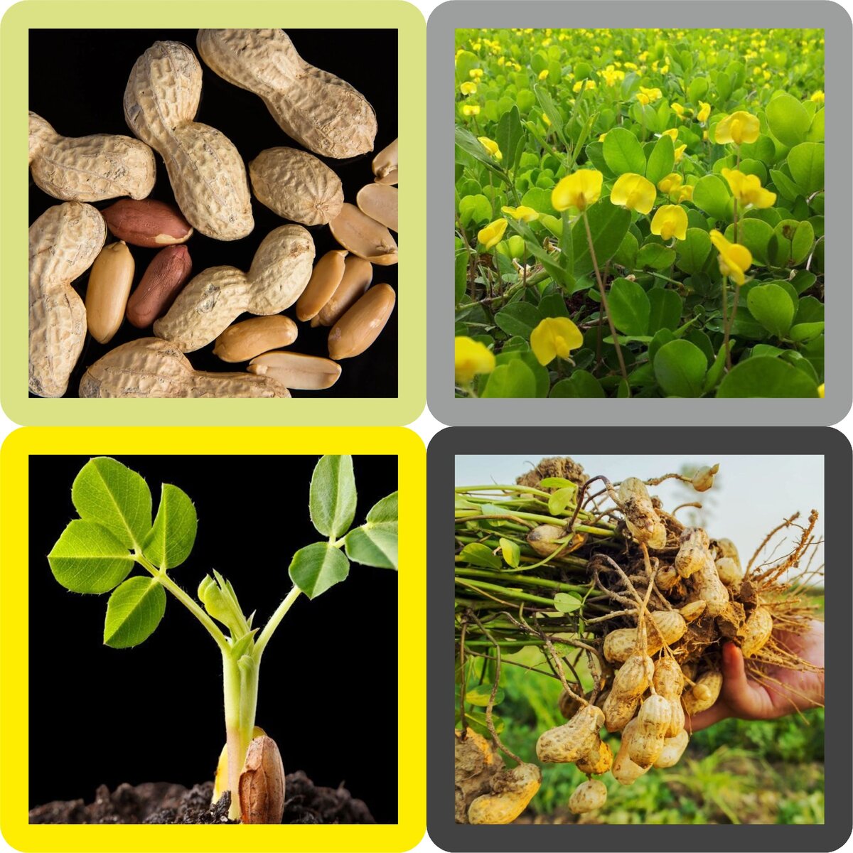 Арахис - очень теплолюбивый однолетник семейства бобовых. Растения с ветвистыми побегами высотой 30 см с жёлтыми цветками, расположенными кистями на ножках в пазухах листьев. Плоды - вздутые, овальные, 2-4-семянные бобы, с паутинистым рисунком, созревая, наклоняются к земле и зарываются в неё, где и дозревают. Чаще используется для контейнерного выращивания.