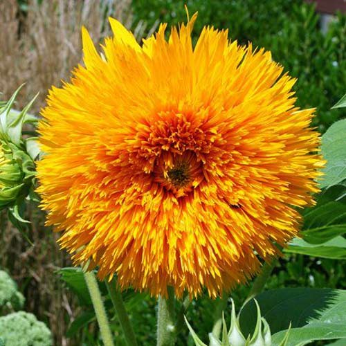 Дабл Делайт F1 – махровый гибрид длинного дня, с оранжевыми лепестками в несколько рядов, формирующих красивую пышную шапочку так, что не видно семян. Цветок крупный(d-15-17 см), окраска диска светло-зеленая, время от посева до цветения - 45-55 дней, не вызывает аллергии, так как почти не образует пыльцы. В ландшафте подсолнечник эффектно выделяется при создании живой изгороди вдоль заборов, в группах на газонах, в миксбордерах, удачно смотрится в стиле «Кантри», а одиночное растение в горшке выглядит строго и торжественно. Это прекрасный цветок на срезку, стоит в воде около 2-х недель. Из него можно составить оригинальный букет, который принесет в дом ощущение летнего теплого дня, покоя и умиротворения. Считается, что подсолнух побеждает депрессии и печаль.