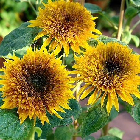 Гибрид со 100% густо махровыми соцветиями. Специальная селекция для выращивания в горшках и контейнерах объемом от 5 до 15 литров. Растение компактное, на толстом стебле, высотой 35-45 см. Характерные махровые “пушистые” соцветия 10-15 см. Лепестки периферийных цветков соцветия ярко-желтые, с длинным лепестком, центральные цветки соцветия рыже-шоколадные. Эффектные “пушистые” соцветия, обладающие полусферической формой. Очень интересный рыже-шоколадный цвет. Холодостойкое, прекрасно переносит весенние перепады температур и осенние холода. Возможно выращивание без рассады, прямым посевом семян в горшок или в грунт на клумбу.