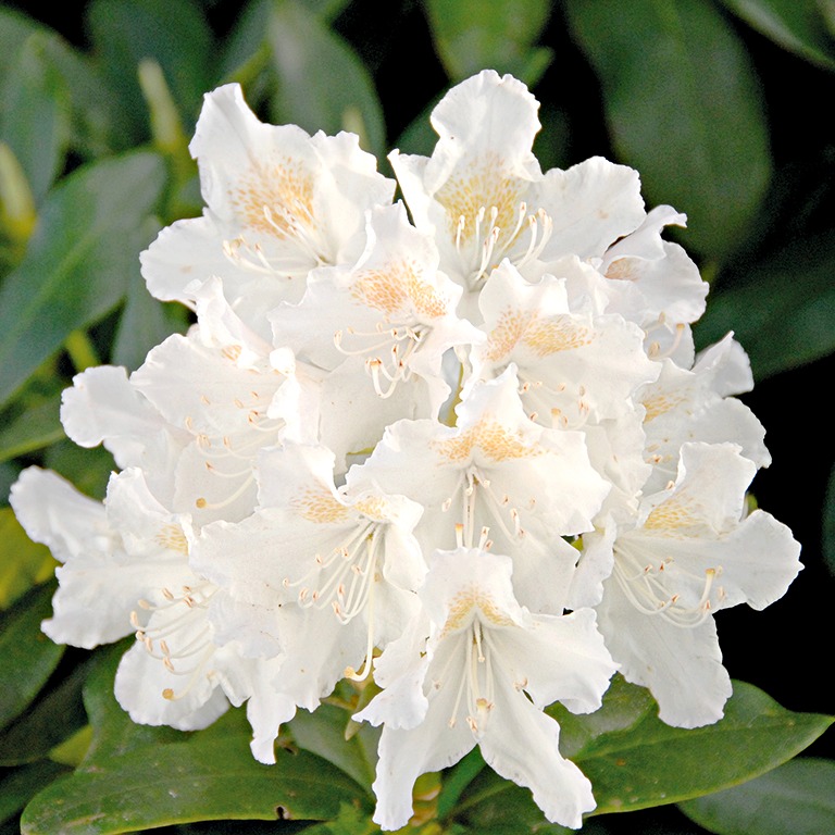 Рододендрон каролинский будет радовать Вас своим необычайно эффектным внешним видом круглый год! Вечнозеленый кустарник высотой до 1,5 м с широкоокруглой кроной и светло-коричневой корой. Листья эллиптической формы до 10 см длиной, темно-зеленого окраса. Цветки диаметром 3-4 см белоснежного или светло-розового окраса собраны в соцветия по 4-9 штук. Цветение май-июнь. В саду рододендрон будет великолепно смотреться в одиночных и групповых посадках, кроме того отлично подойдет для создания рокариев и посадки вдоль дорожек.