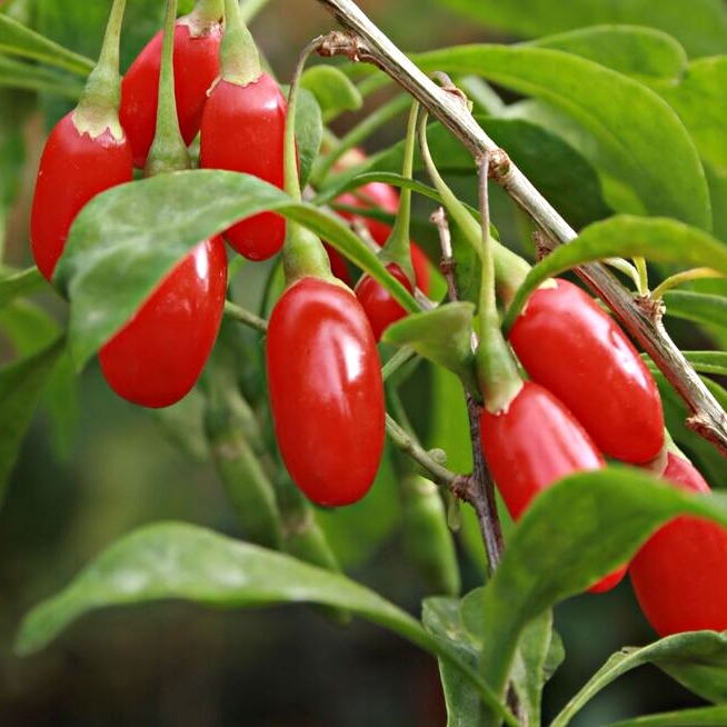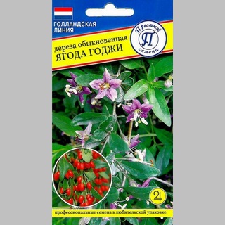 Уникальный сорт, при выращивании из семян зацветает уже в год посева и завязывает первые ягоды. А на второй-третий год жизни с растения можно получать полноценный урожай целительных ягод. Годжи — истинное чудо, подаренное человеку природой. Причина - в уникальном наборе природных компонентов. Содержит 21 минерал (такие, как железо, цинк, йод), 18 аминокислот (это больше, чем в маточной пыльце пчел), восемь из которых организм человека не производит, витамины В1, В2, В6, Е и С, 4 незаменимых полисахарида, которых больше нет ни в одном продукте питания. Кустарник до 3 м в высоту, с мягкими слабо вьющимися стеблями, покрытыми эллиптическими листьями. Цветки лиловые, растущие в пазухах листьев по несколько штук, колокольчатые. Плодоносит Годжи с лета до осени. Красные продолговатые и очень сочные ягоды имеют сладко-горьковатый, реже кисловатый вкус. В сушеном виде ягоды Годжи напоминают очень крупный изюм.