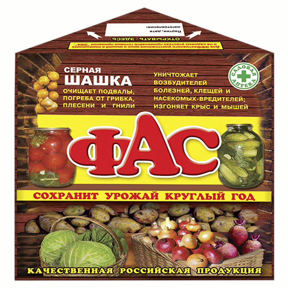 Дозировка и способ применения : Повышенное содержание серы в составе шашки обеспечивает активное горение с выделением более концентрированного дыма. Дым легко проникает во все уголки обрабатываемых помещений и позволяет гарантировать их полное обеззараживание. Пустые погреба и подвалы обрабатывать до закладки картофеля и овощей на хранении. Норма расхода: 30-60г/см3 (1 шашка на 5-10м3). Теплицы, парники, оранжереи окуривать до посадки культур, а также после сбора урожая. Норма расхода: 60г/см3 (1 шашка на 5-10м3). Перед обработкой все щели между рамами, дверьми, крышками погребов уплотнить влажной тканью, войлоком или другими герметизирующими материалами.