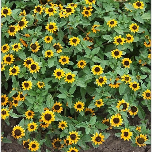 Сорт, формирующий крупные почвопокровные кусты. На грунте формируется характерная “подушка” из многочисленных, сильно разветвленных побегов длиной до 40 см, усыпанных миниатюрными “подсолнухами”. Прекрасное растение – компаньон для комбинации в вазонах с другими растениями. Одно из лучших для балконных ящиков. Цветки ярко-желтого цвета с черной серединкой. Побеги и листья жесткие, ярко-зеленые, не повреждаются вредителями и непогодой. Растение высотой (вместе с цветоносом) 25-30 см.