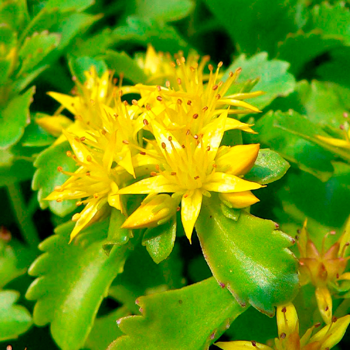 Выносливый почвопокровный многолетник. Зацветает с 1-го года вегетации лимонными «звездочками» диаметром 1-2 см. Слегка полегающие побеги образуют симпатичные плотные кустики высотой около 10 см. Листья с зубчатым краем, мясистые, относительно крупные для седумов. Растение стойко переносит зиму, развивается на бедных и сухих почвах и даже в трещинах камней. Возделывается в качестве декоративно-лиственной культуры и отвечает всем требованиям ландшафтного озеленения. Гармонично вписывается в цветники разных форм и стилей, украшает бордюры и альпинарии. Для поддержания красивого облика старые соцветия удаляют после цветения.