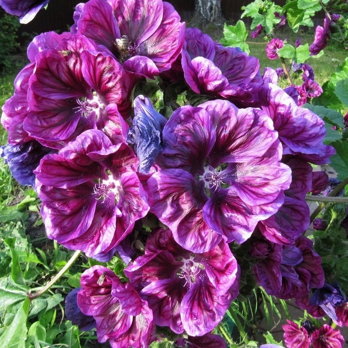 Многолетнее растение, культивируемое как двулетник. Большие округлые зубчатые листья в первый год образуют мощную розетку. Цветки крупные, диаметром до 8 см, сиренево-лиловые с гофрированным краем. Ярко выраженное малиновое жилкование создает эффект мраморности цветков. Мальва светолюбива и теплолюбива. Хорошо растет на плодородной, легкой почве. Используют мальву для создания акцентов в групповых посадках на газоне, в солитерах, миксбордерах. Хорошо стоит в срезке. Эффектный цветок для "ленивых" садоводов.